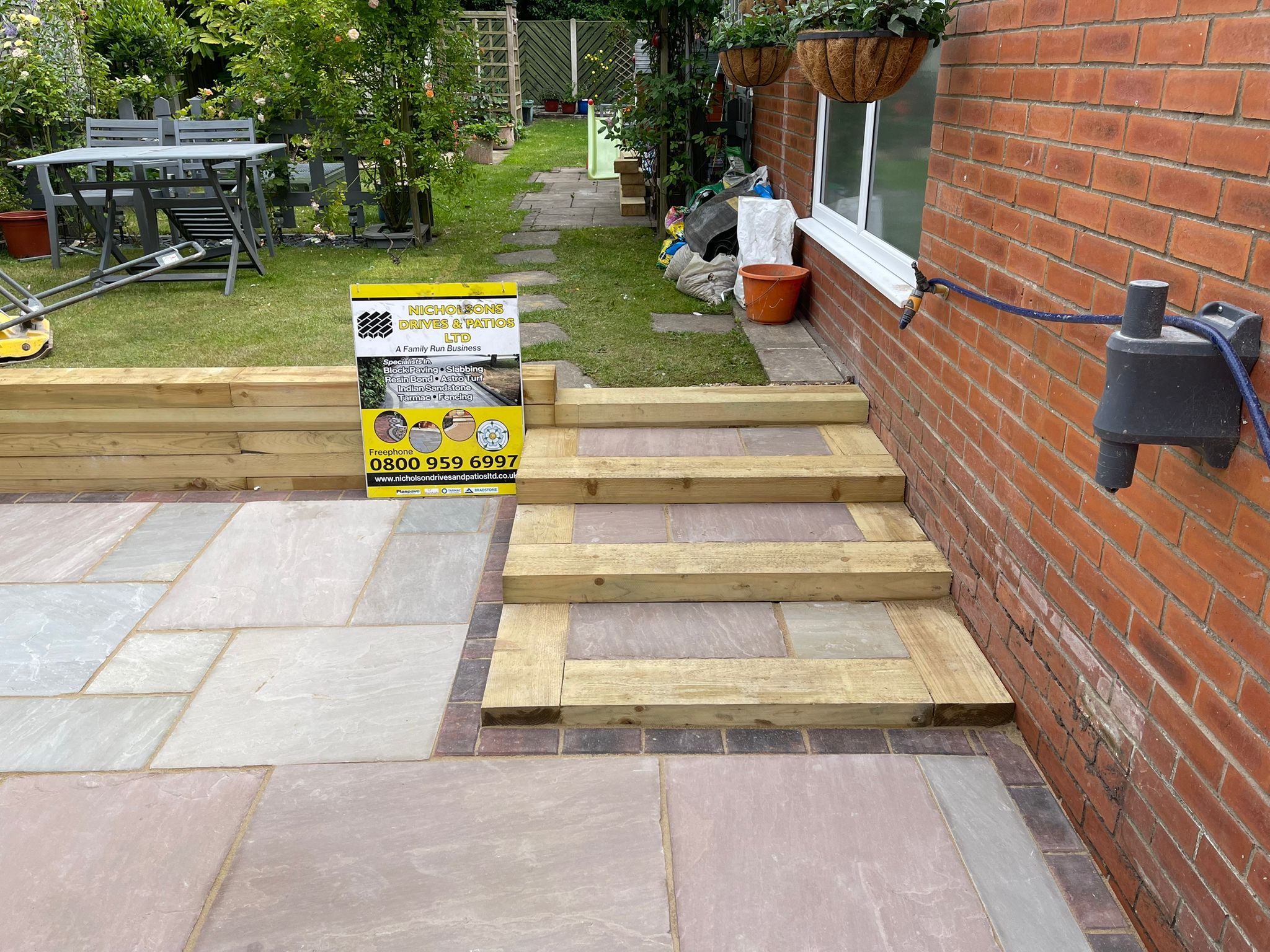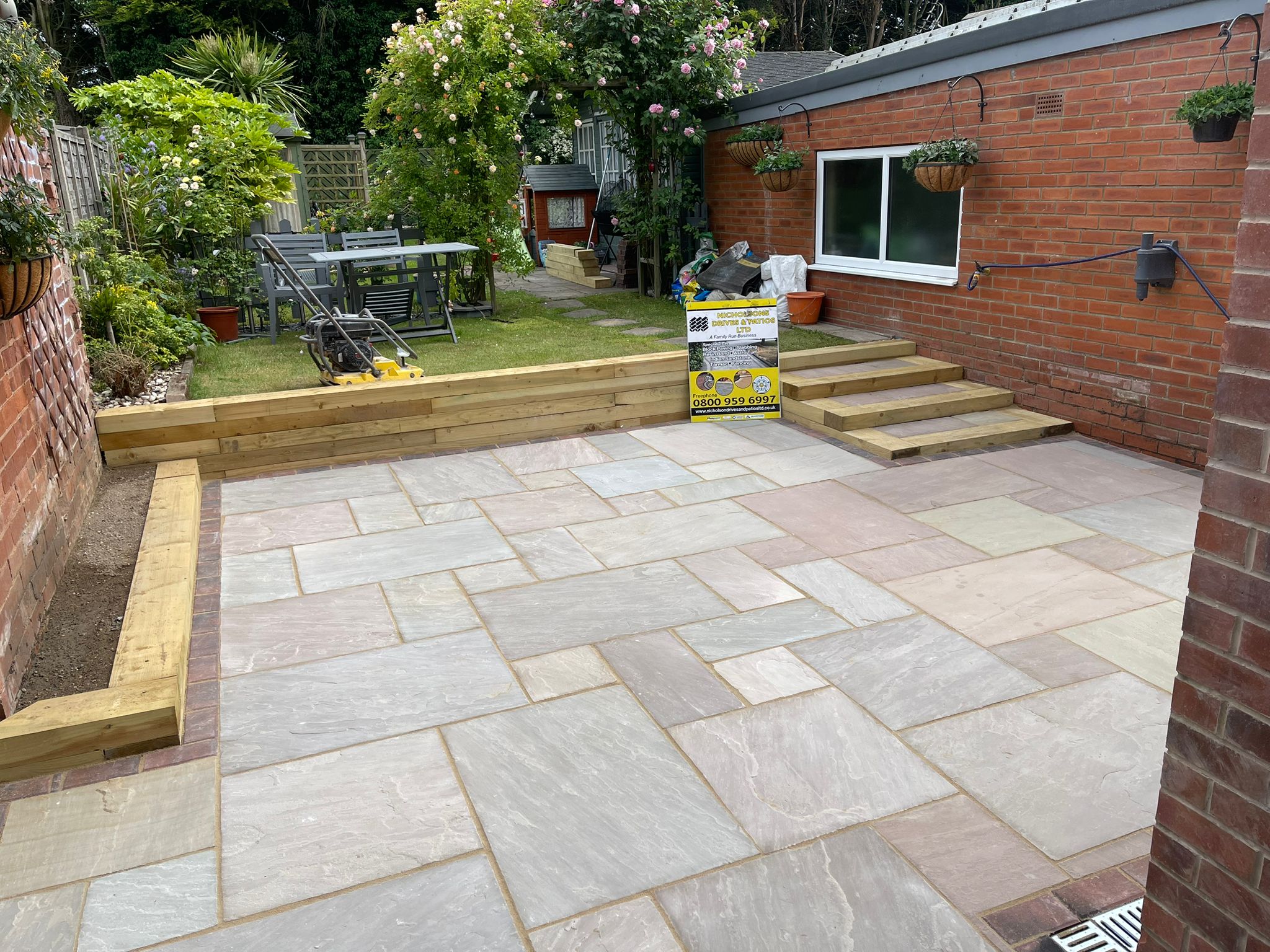 Sleeper Work and Indian sandstone with block paving edging